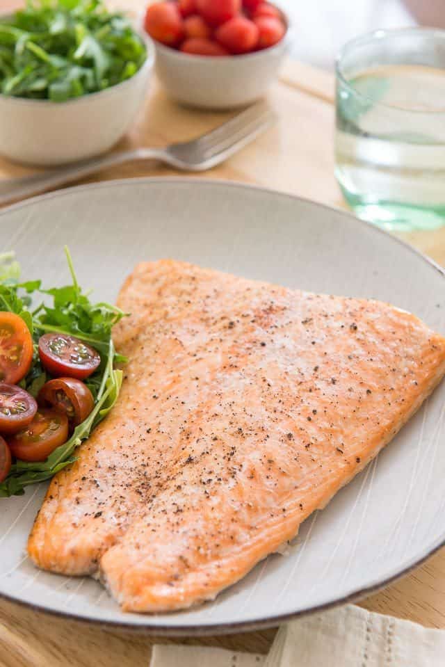 - Season the top of the salmon generously with salt, about 1/2 tsp for a 1lb piece. I don't season the bottom of the fish, since I discard the skin.