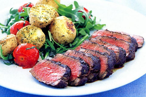 - Meanwhile, preheat barbecue grill on high. Drain lamb and cook for 4 minutes each side for medium (3 minutes for fillets). Rest 5 minutes, then slice. Add basil and rocket to potatoes and serve with lamb.