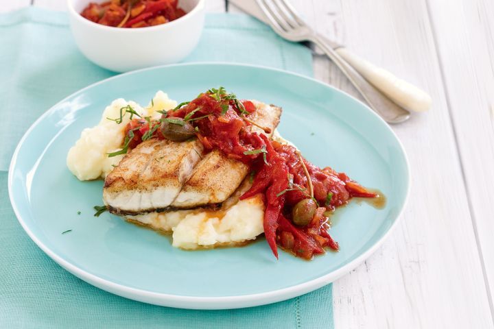 - Melt remaining butter in a frying pan over medium heat. Cook fish, in batches, for 3 to 4 minutes each side or until cooked through. Serve with mash, tomato caperberry sauce and parsley.