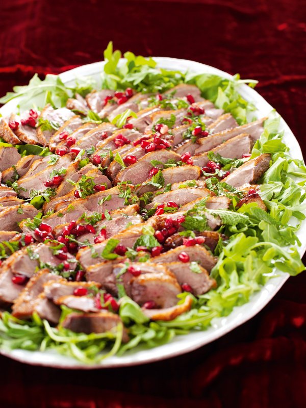 - Slice each duck breast very thinly on the diagonal and lay on the salad-lined dish, pouring any meat juices over them as you go.
