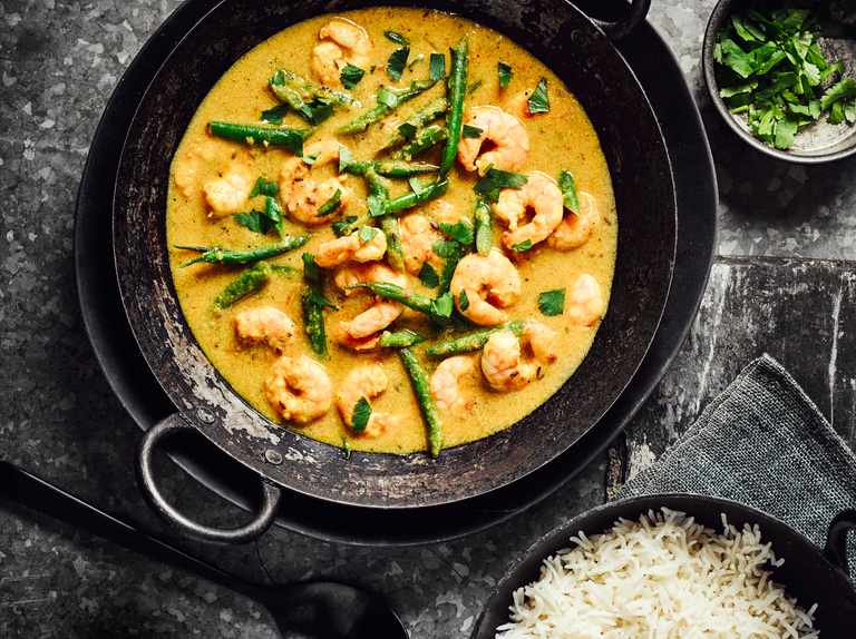 Check out this quick and easy Indian curry recipe packed with juicy prawns, creamy coconut milk and crunchy green beans.