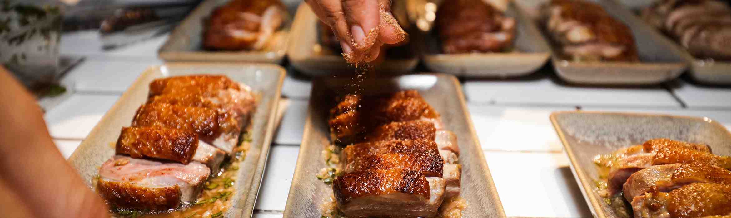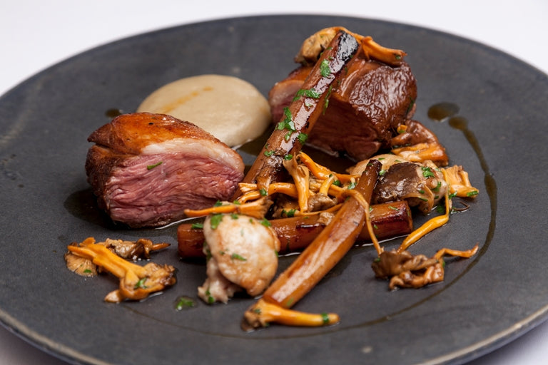 Prep Time • Prep time: 5 minutes • Cook time: 20 minutes • Yield: Serves 2 Ingredients Duck breast: • 1 clove garlic • Sea salt flakes • 5 sprigs thyme • Freshly ground black pepper • 1 Luv-a-Duck Duck Breast, tenderloin removed Ponzu dressing: • 50ml...