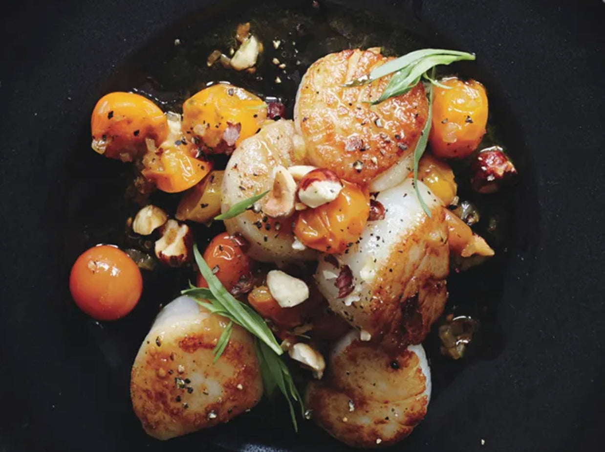 Scallops with Hazelnuts and Warm Sun Gold Tomatoes