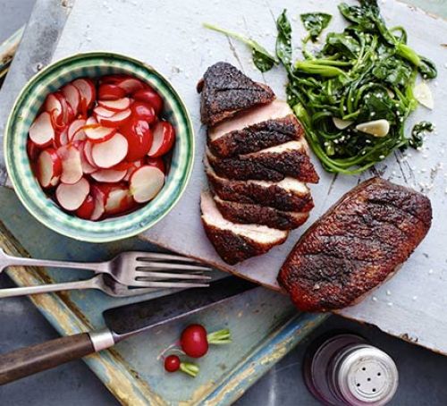 Make the most of this turnip-like vegetable by stir-frying the green leaves and pickling the veg - serve with rich Asian-spiced meat. Prep Time • Prep time: 15 minutes • Cook time: 40 minutes • Yield: Serves 2 Ingredients For the Pickled Radishes: • 2 bunches radishes, sliced,...