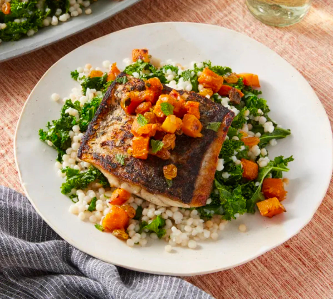 Honeynut squash, a sweet and petite variety of butternut, gets the star treatment in this recipe. (Your squash may have beautiful green stripes.) I use it to make an agrodolce—a sweet-and-sour Italian condiment—to top our barramundi. My agrodolce combines honey and vinegar with raisins and red pepper flakes for pops...